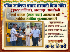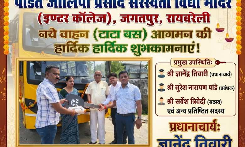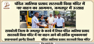 ✍️ क्षेत्र के प्रतिष्ठित शिक्षण संस्थान पंडित जालिपा प्रसाद सरस्वती विद्या मंदिर, जगतपुर कस्बा में शिक्षा सुविधाओं के विस्तार और छात्र-छात्राओं के सुगम आवागमन हेतु एक नए वाहन का आगमन हुआ है। विद्यालय परिसर में आयोजित एक संक्षिप्त कार्यक्रम के दौरान नए वाहन का विधिवत पूजन कर उसे विद्यालय के बेड़े में शामिल किया गया।इस अवसर पर विद्यालय के प्रधानाचार्य ज्ञानेंद्र तिवारी ने खुशी जाहिर करते हुए कहा कि संस्थान सदैव छात्रों की सुविधा और सुरक्षा के लिए प्रतिबद्ध है। नया वाहन आने से सुदूर क्षेत्रों से आने वाले विद्यार्थियों को काफी सहूलियत होगी।