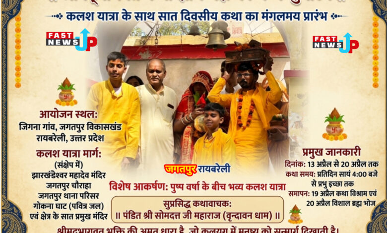 ✍️रायबरेली जिले के जगतपुर विकासखंड अंतर्गत जिगना गांव में सोमवार को सात दिवसीय श्रीमद्भागवत कथा ज्ञान यज्ञ का मंगलमय शुभारंभ हुआ। इस पावन अवसर पर भव्य कलश यात्रा निकाली गई, जिसमें आस्था का सैलाब उमड़ पड़ा।