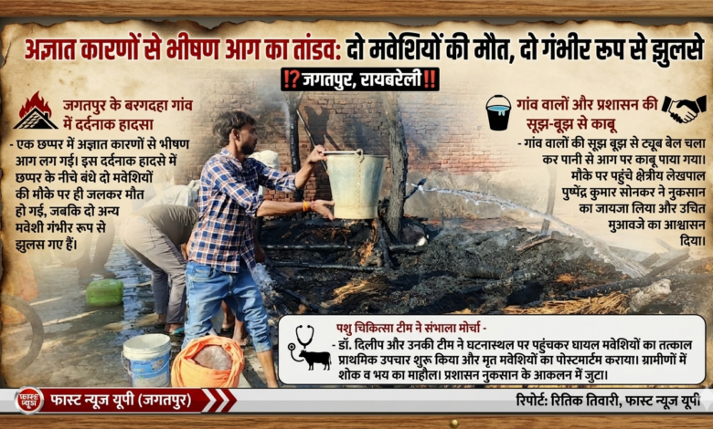 ✍️ जगतपुर विकासखंड क्षेत्र के अंतर्गत बरगदहा गांव में उस वक्त हड़कंप मच गया, जब अज्ञात कारणों से एक छप्पर में भीषण आग लग गई। इस दर्दनाक हादसे में छप्पर के नीचे बंधे दो मवेशियों की मौके पर ही जलकर मौत हो गई, जबकि दो अन्य मवेशी गंभीर रूप से झुलस गए हैं। वही गांव वालों की सूझ बूझ से ट्यूब बेल चला कर पानी से आग पर काबू पाया गया ।वही प्रशासनिक टीम ने संभाला मोर्चा। घटना की सूचना मिलते ही क्षेत्रीय लेखपाल पुष्पेंद्र कुमार सोनकर तुरंत मौके पर पहुंचे और स्थिति का जायजा लिया। साथ ही किसान को उचित मुआवजा देने की बात कही साथ ही, पशु चिकित्सा विभाग को सूचित किया गया।